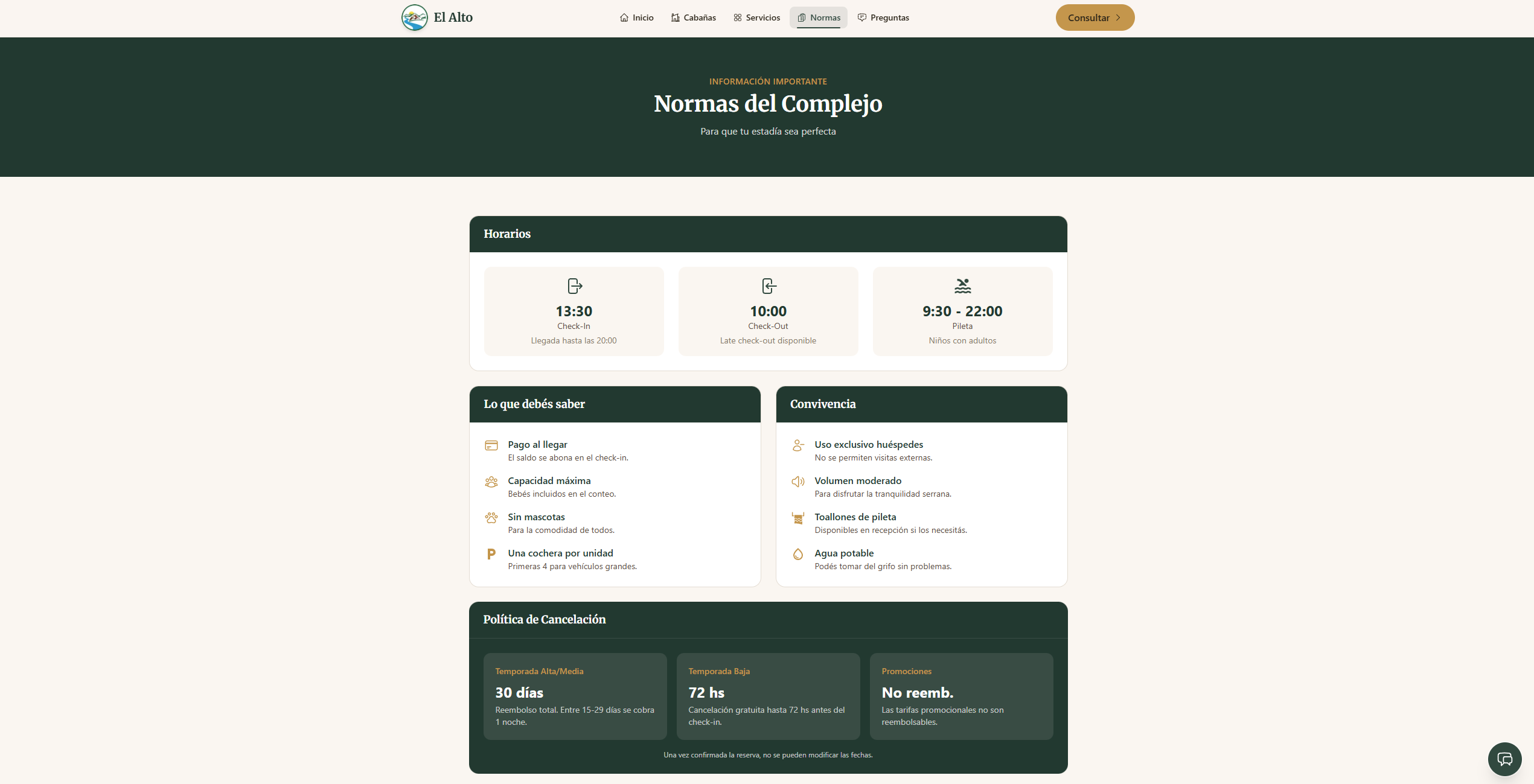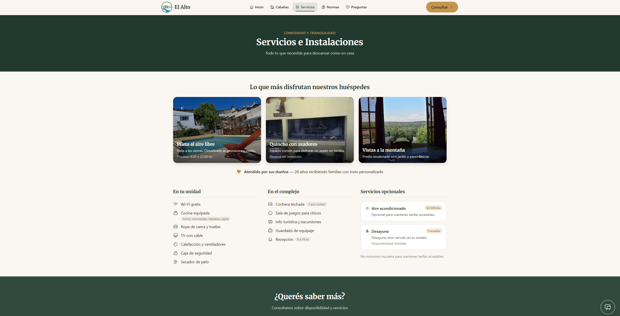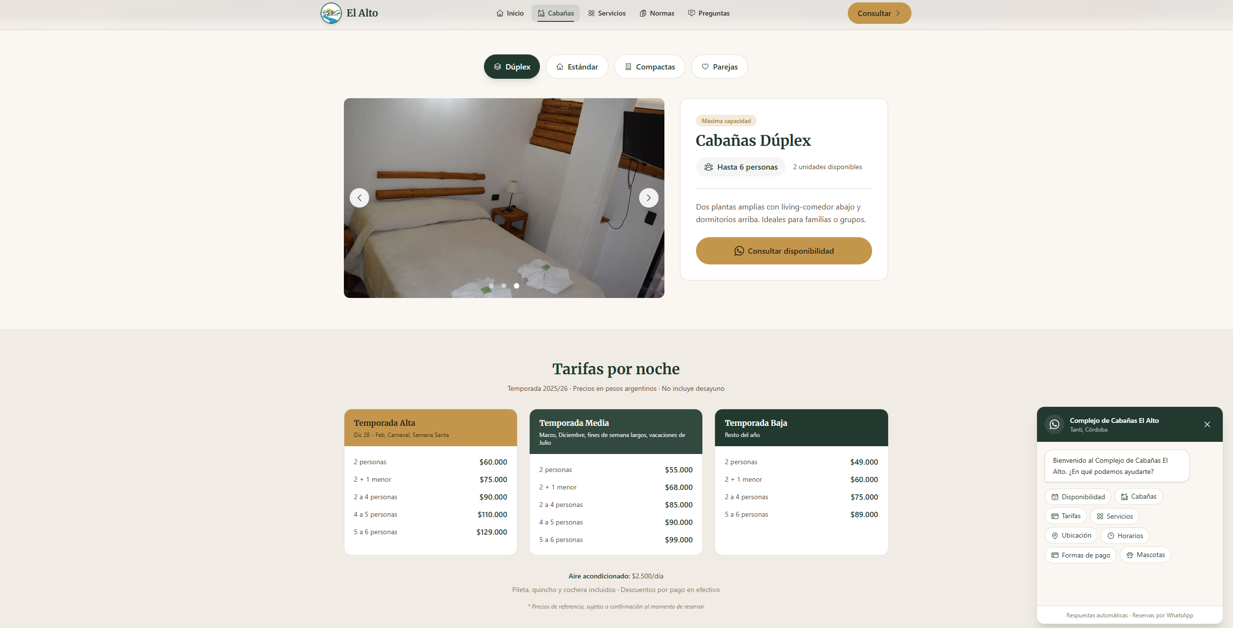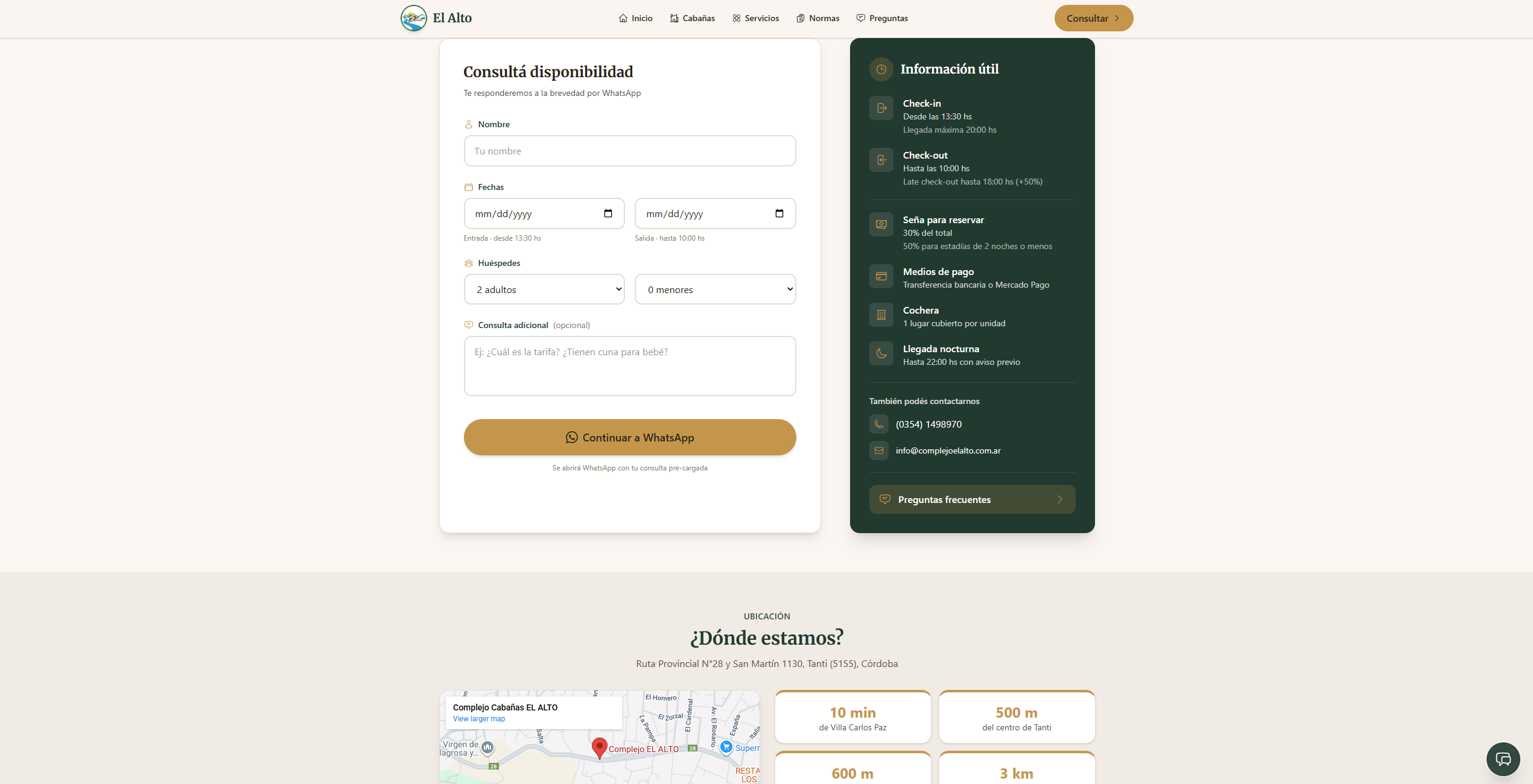 Website for a cabin rental complex in Tanti, Córdoba, Argentina. Built a chatbot-style contact form that collects dates and guest count before opening WhatsApp, solving the problem of empty 'Hola' messages. Integrated Sanity CMS for self-service price updates and Google Analytics for conversion tracking.